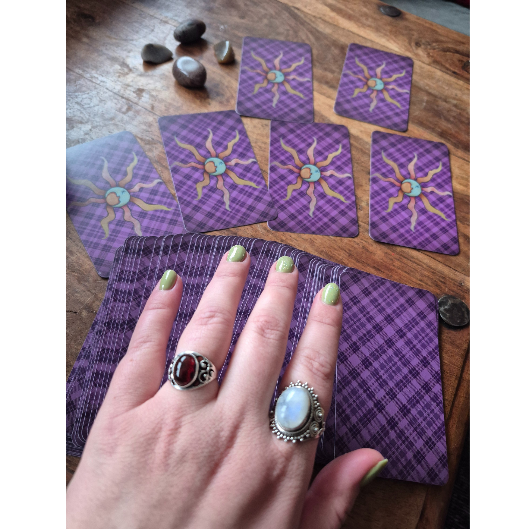 De er klassiske Rider-Waite-Smith kort, men på dansk! Og så har vi piftet symbolerne op! Der er lagt et smukt lilla fundament i kortene, så de giver den ro og dybde som er essentiel for energien i MoseHeksen.